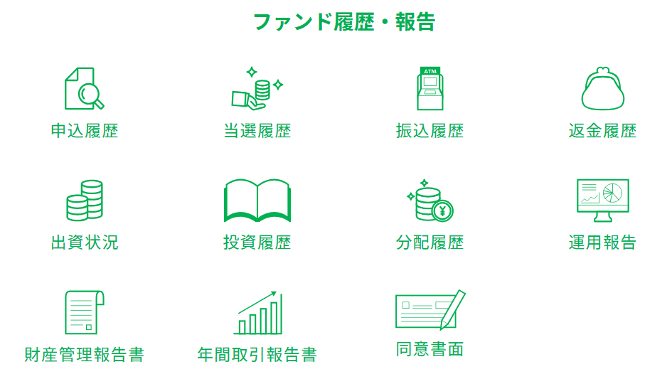 「運用報告」:出資したファンドの月次の運用報告(速報ベース)の確認ができます。